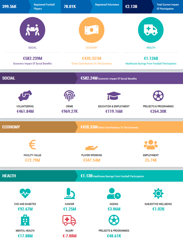 Voetbal brengt het bruto binnenlands product van ons land ongeveer 120 miljoen euro op. Dat is toe te schrijven aan meer mensen die dankzij het voetbal opleidingen of een specifieke training volgen en dan naar school gaan en werken. Daarnaast zorgt de sport er ook voor dat minder Belgen in de criminaliteit belanden, wat opnieuw een besparing qua maatschappelijke kosten betekent. Tel daarbij het equivalent aan onbezoldigde prestaties van alle vrijwilligers in het voetbal, goed voor 460 miljoen euro aan vergoedingen die clubs uitsparen en elke dag opnieuw de sport sterker maken, dan bedraagt de sociale impact van ons voetbal 580 miljoen euro. Kijken we puur naar de economische bijdrage van ons voetbal, dan moeten we nog eens 420 miljoen euro tellen.